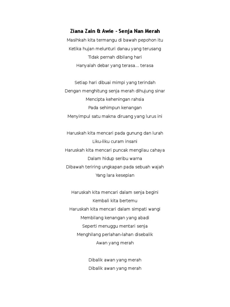 F Bm Em A. Ziana Zain Awie Senja Nan Merah Official Lyric VideoPerformed By Ziana Zain AwieAlbum Merah Original Soundtrack Composed By Darwis Lyrics By S. Haruskah kita mencari dalam simpati wangi kembali kita bersama.